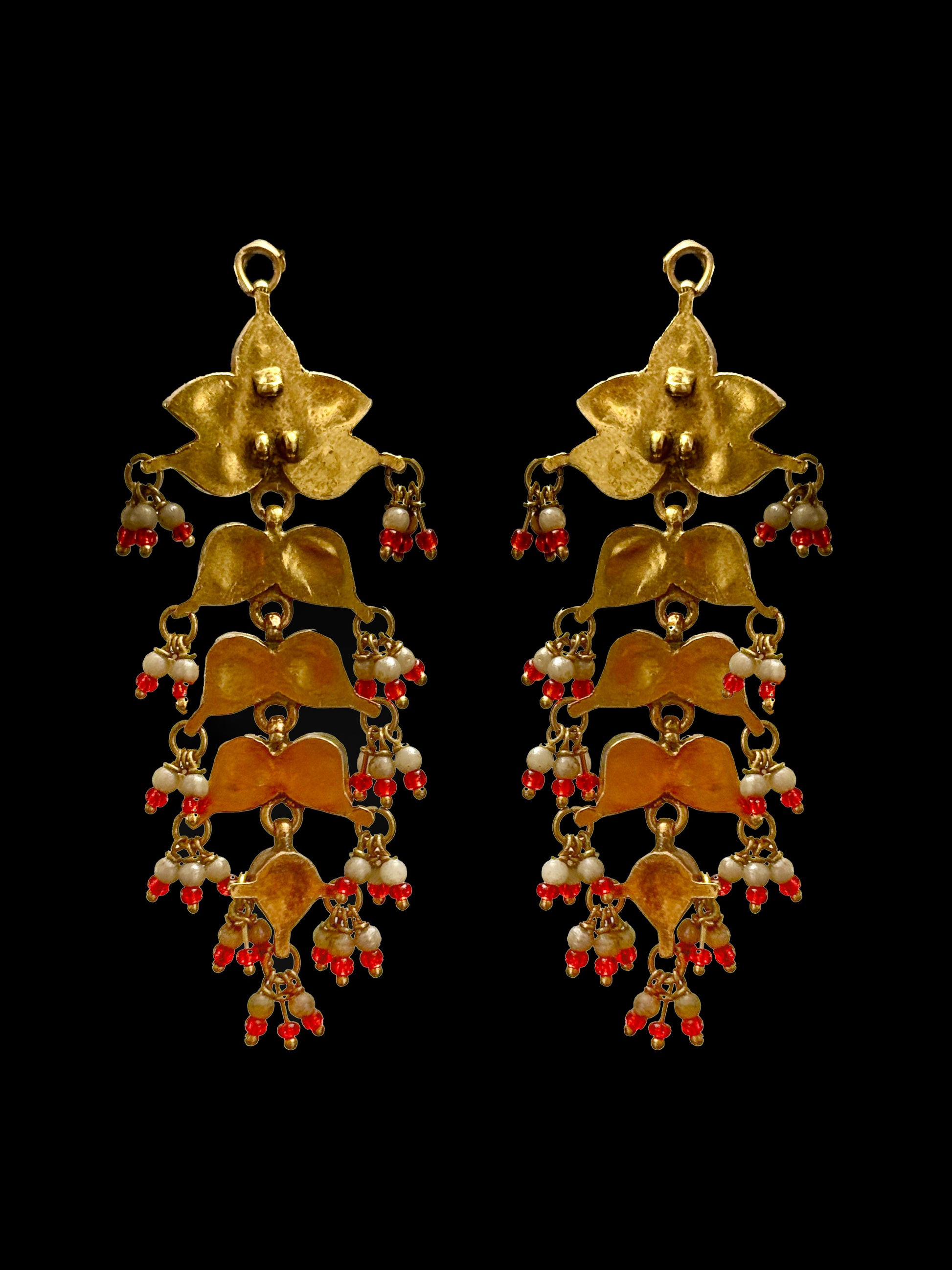 Boucles d'oreilles pendantes indiennes en or 20 carats serties de rubis et de petites perles fines.