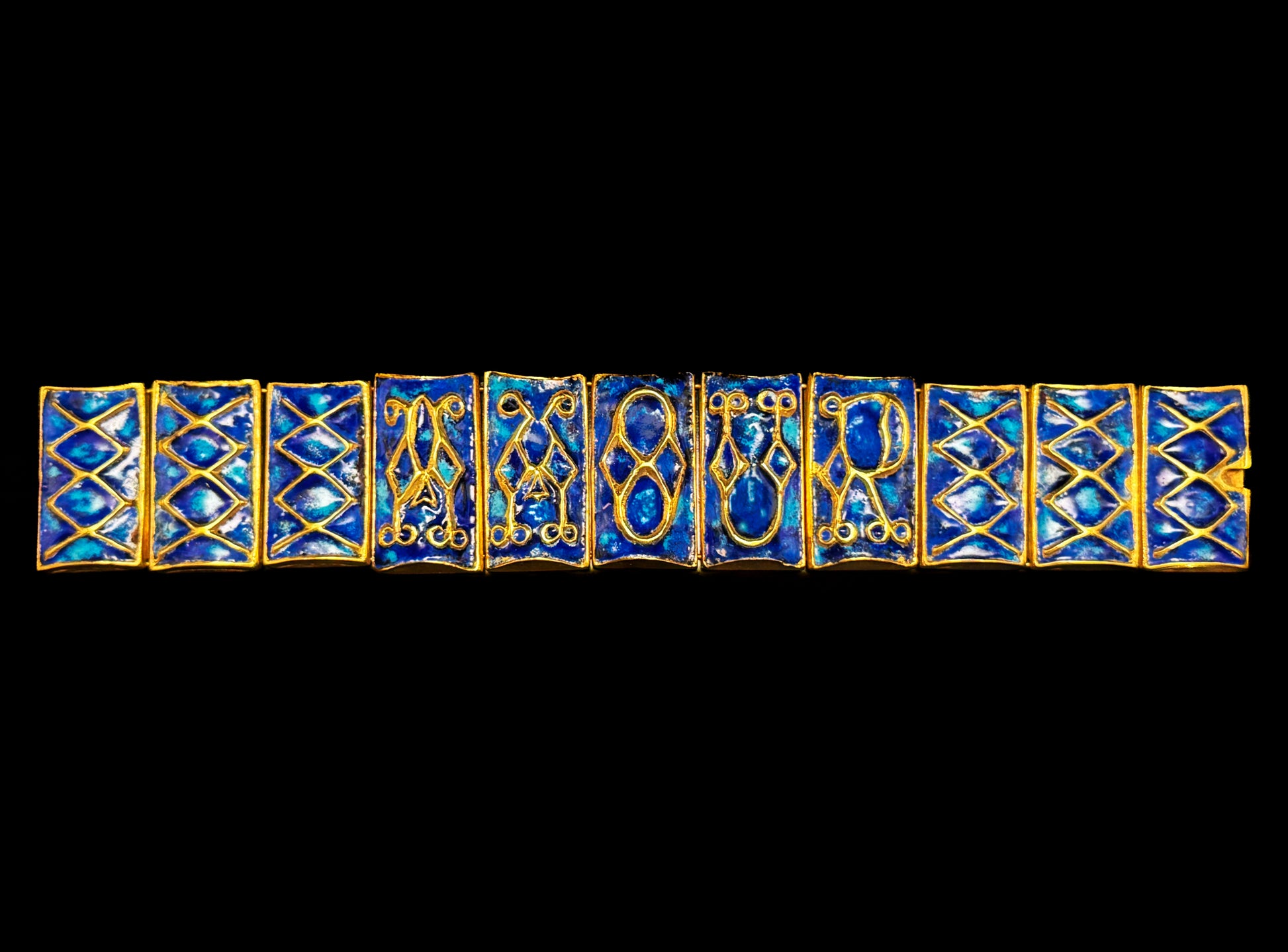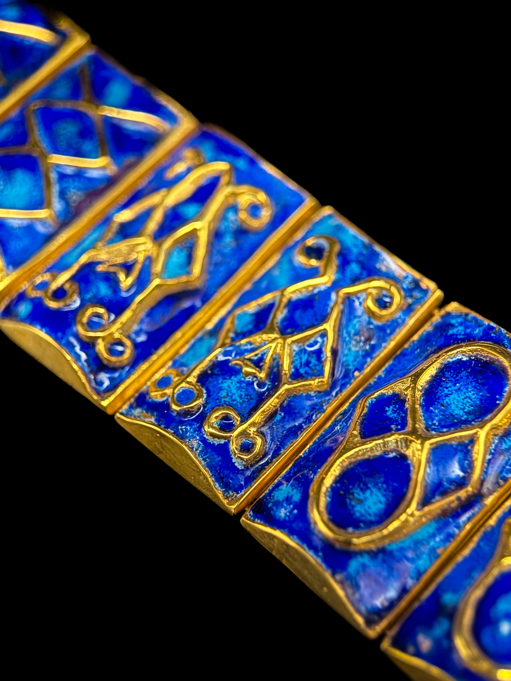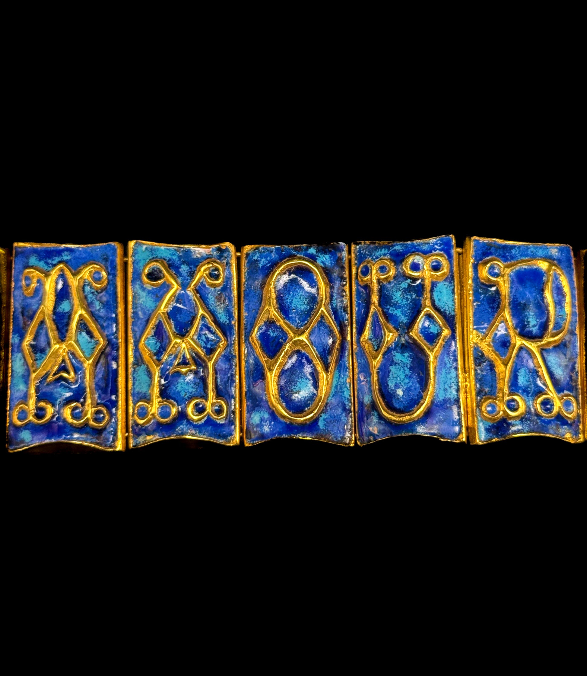 Bracelet en bronze doré et émail bleu, « AMOUR », inscrit sur les éléments centraux.