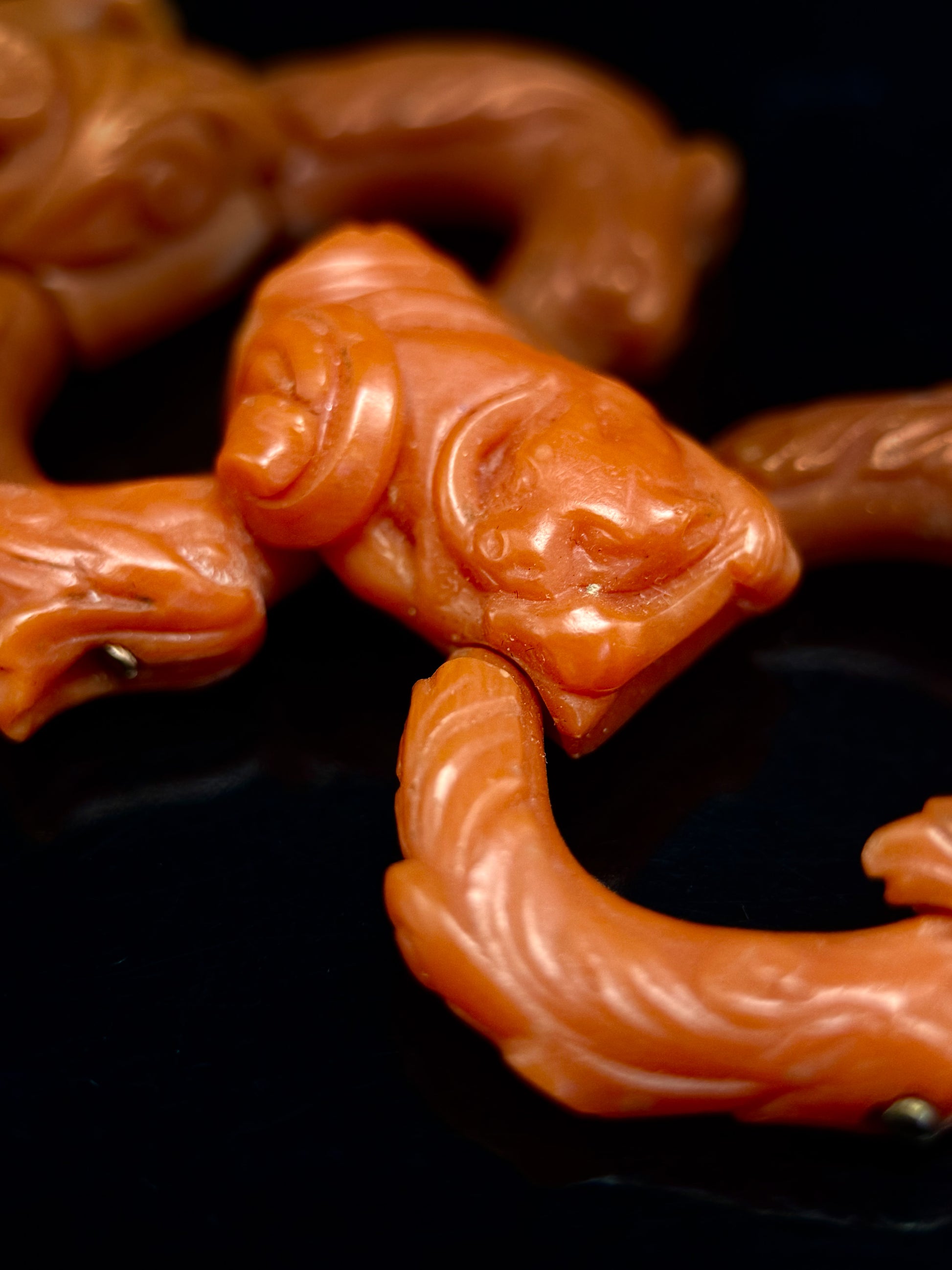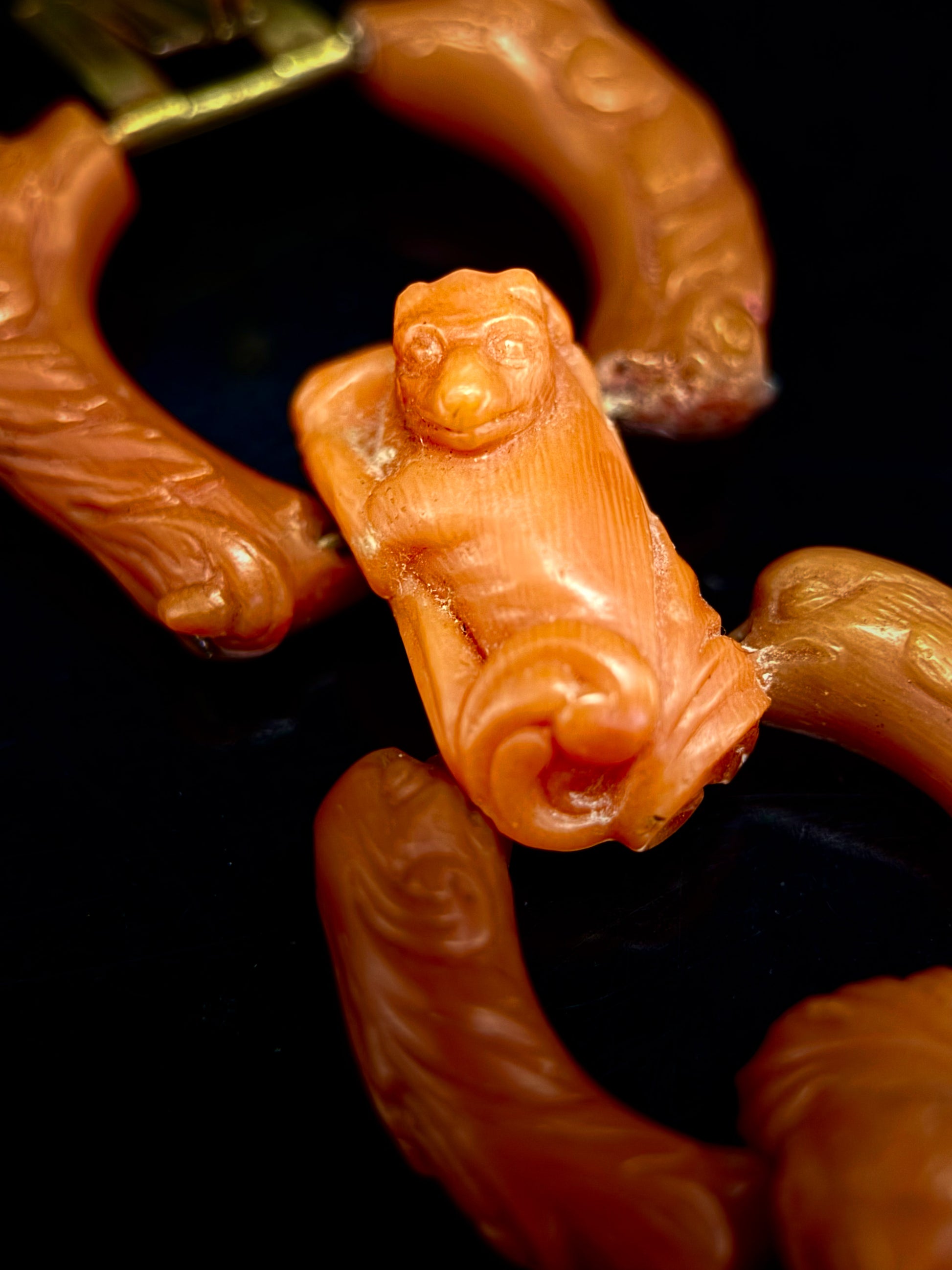 Bracelet en corail composé de cinq maillons. Chaque maillon est sculpté d'une créature fantastique, et le bracelet est orné d'un saint.