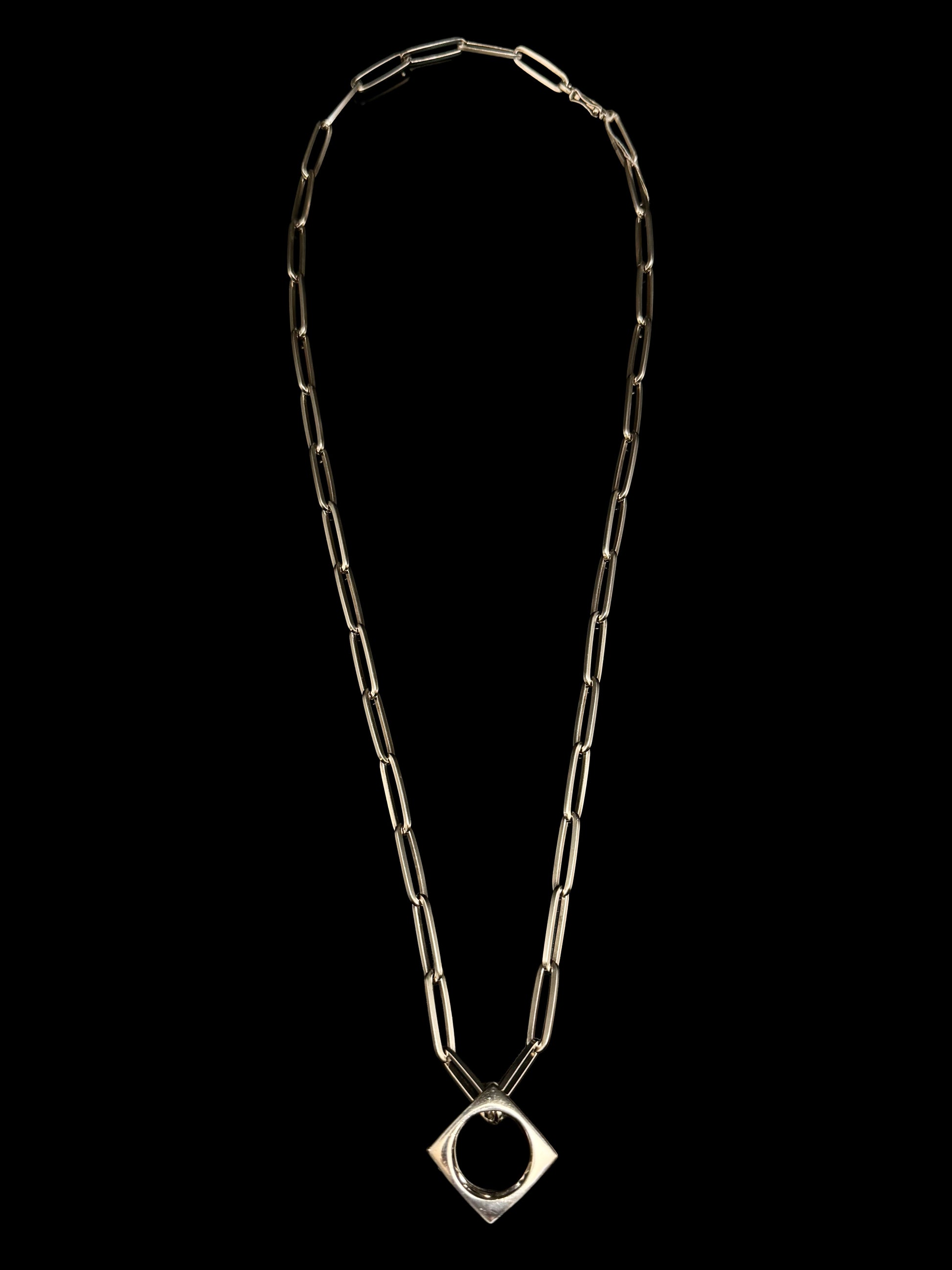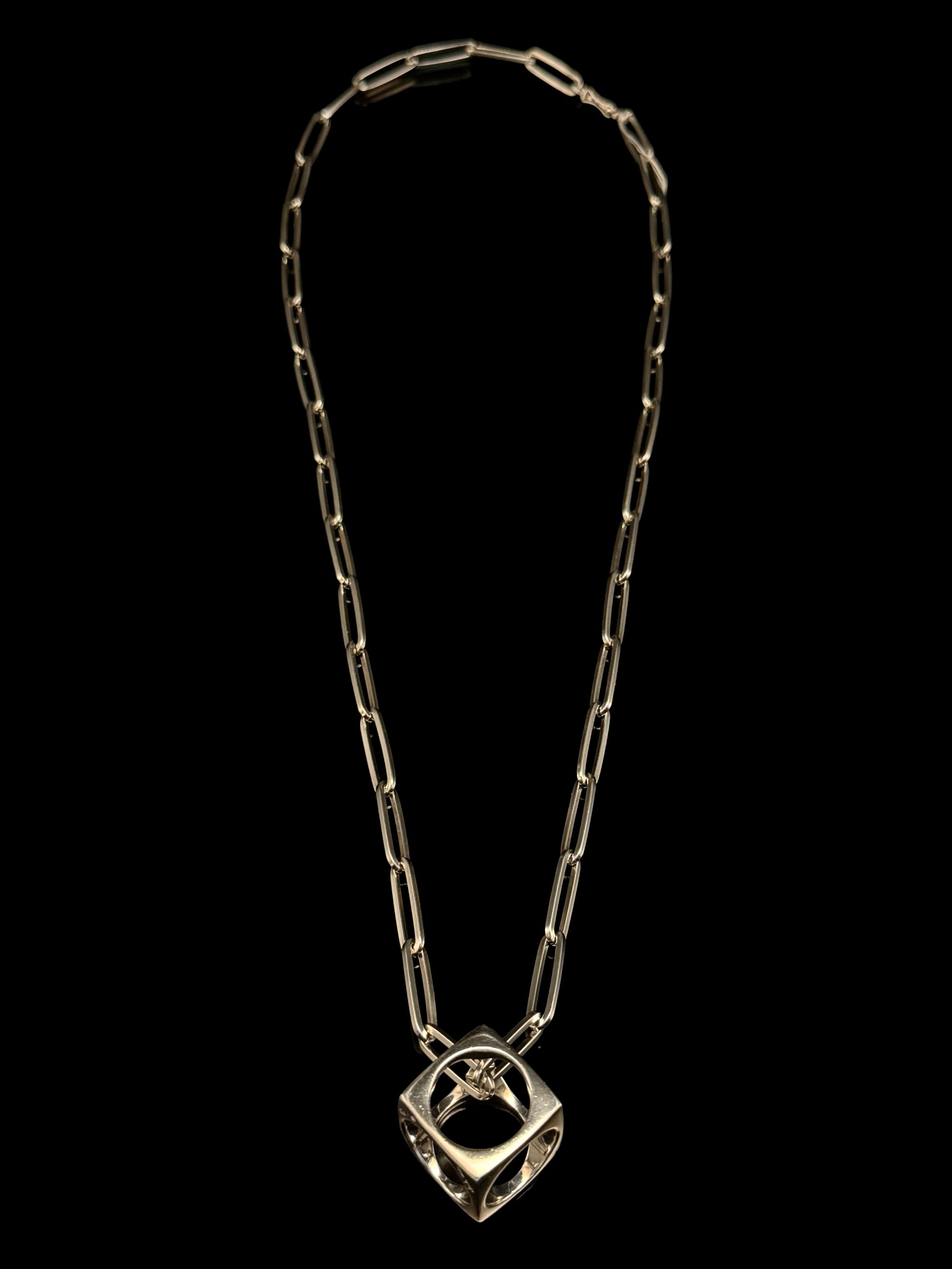 A chain silver necklace with removable cube pendant, wich can be worn on its own as a ring.