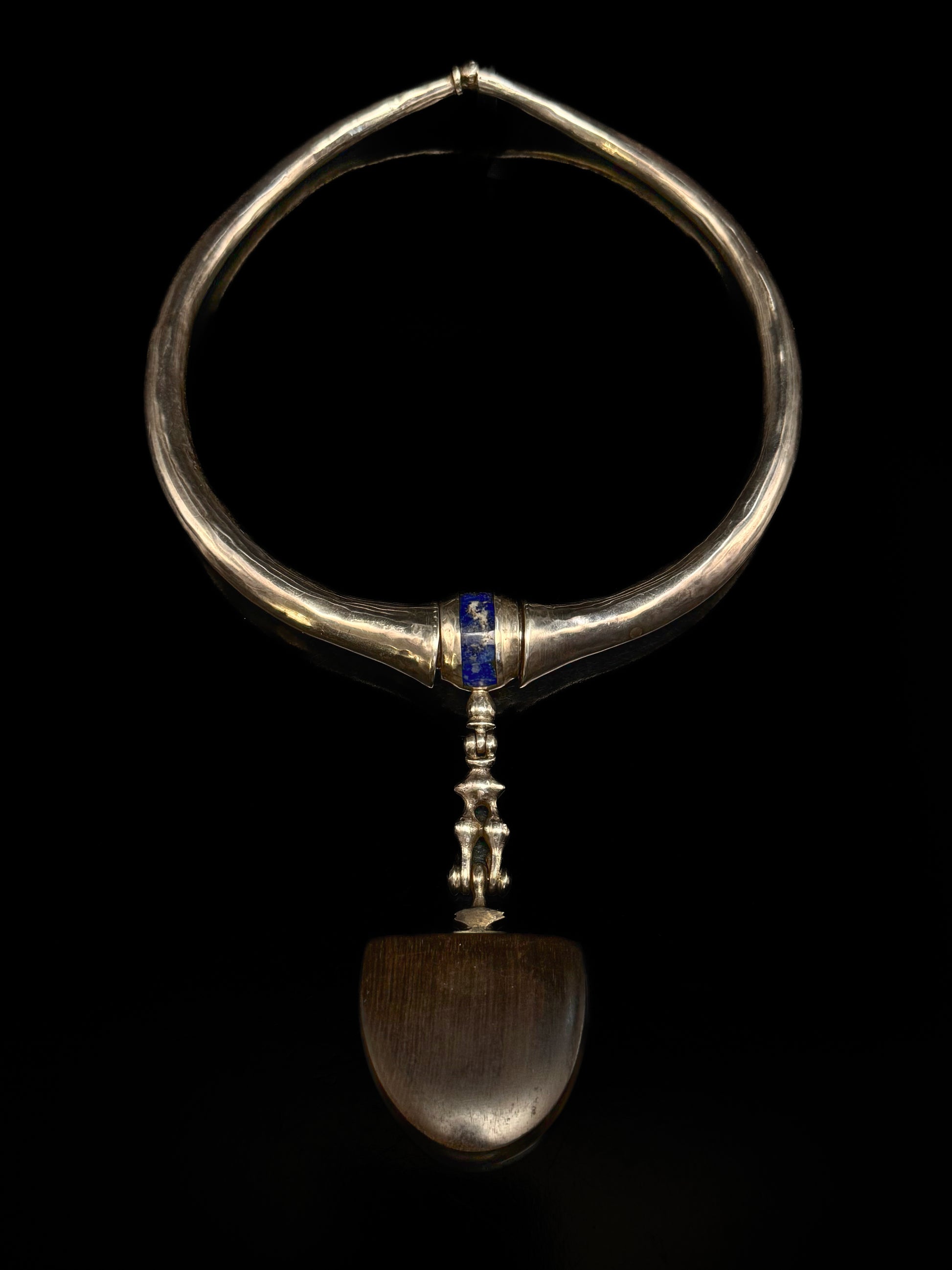 A hammered silver torque necklace, featuring a pendant in ebony and lapis lazuli.